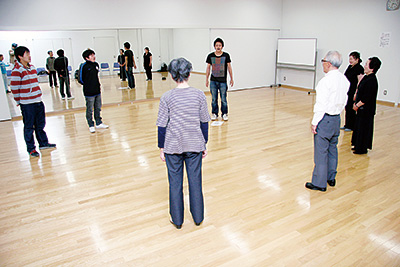 当日は応援に駆けつけた高校時代の後輩も含め10名が参加。松岡さんの指導で演劇の初歩を味わった。タウン誌の記事を見て参加した女性は「どんなことをするのか、楽しみでした。実際に声を出したり、体を動かせて楽しいです。若い人たちや子どもたちとも交流したいです」と満足そうだった。同会場で毎月一回ずつ行われる。