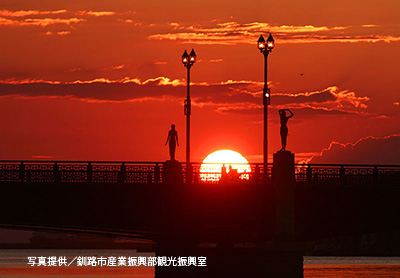 釧路の自慢はバリ島やマニラとともに「世界の三大夕日」と呼ばれる夕日です。私は釧路川にかかる幣舞橋の向こうに見える夕日が好きです。橋と橋の欄干にある四季を表す彫像のシルエットがオレンジ色の空に浮かび、美しい景色を見せます。