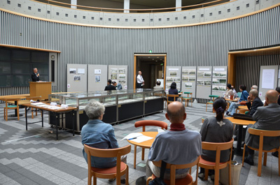 展示期間中の11月15日と26日には講演「ご移転の真実を語る資料─遷祖式を中心として─」(講師:関根)も行われました。總持寺建設にまつわる逸話やそれに尽力した人々の姿、一行の入山の模様、遷祖式、上棟式のにぎわい、二千人以上の参列があった西有禅師の荼毘式の流れや一連の新聞報道なども細かく解説しました。