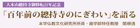 この總持寺御移転百年を記念してさまざまな行事が行われましたが、本学でもその一環として昨年11月14日から27日の2週間にわたって、鶴見大学仏教文化研究所主催、鶴見大学生涯学習センター協賛「百年前の總持寺のにぎわい 記念パネル展」が行われました。一昨年のプレパネル展も本学大学会館センタープラザで行われました。