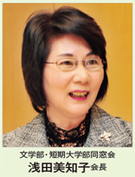浅田 鶴見大学には現在、文学部・短期大学部同窓会と歯学部同窓会の二つがあります。 文・短同窓会は、文学部の第1期生の卒業と同時に発足しました。47年の長い歴史を誇り、同窓生の総数も約4万4千人にのぼります。