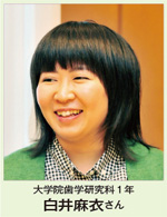 白井 私は2年前に歯学部を卒業しました。学部での6年間は授業のほかに、課外活動として剣道部に入っていたので、毎日が大忙し。国家試験の現役合格をめざして、勉学にも大いに励みました。