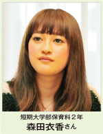 森田 短大の保育科は、修学期間が2年と短く、あっという間に終わってしまった感じです。ただ1年次から授業がびっしり。学ぶことが多く、勉学に追われる毎日で、正直大変でした。