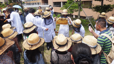 毎年恒例になっている、小学生対象体験イベント「ミツバチを観察しよう」が6月2日(日)に開催されました。心配していた雨も降らず、ミツバチの機嫌も上々で予定したミツバチのミニ講座や身近に巣箱・巣板を観察しての生態確認、蜜絞りなど滞りなく体験することが出来ました。お土産の本校で生産した純度100%のハチミツを味わって頂くことで、さらに豊かな環境教育の素晴らしさを実感して頂けたのではないのでしょうか。