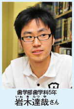 岩木 僕が一番面白いと思ったのは、4年生の前期にあった「咬合学」の授業ですね。虫歯や入れ歯、保存修復、矯正、解剖など、いろいろな学科が組み合わさった授業で、毎回、各学科の先生が交代で教えてくれるんです。まるでオムニバスのような形態の授業で、面白くて毎回、授業に引き込まれてしまいました。 もう一つは、5年次から始まる診療参加型の臨床実習です。歯学部附属病院で、実際に患者さんの治療を担当するのですが、このような実習を実践している歯学部・歯科大は、全国でも数えるほどしかありません。うちの歯学部の最大の特色の一つでもあり、これから本格的に始まる臨床実習が今から楽しみです。