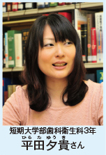 平田 できることなら、もっと実習の時間を増やして欲しい。歯科衛生士としての専門知識を高めるには、教科書による座学よりも、実習で様々な体験をした方が、ずっと効果が大きいと思うんです。