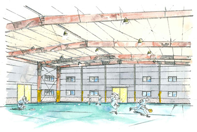 建設地は、JR鶴見駅西口から北西2.3Kmの閑静な住宅街に位置し、三ッ池公園が隣接し四季折々の草花で彩られ緑豊かな丘陵地で、住宅地内での高さ制限が最も厳しい場所です。10mを超えないように室内練習場は、鉄骨造平屋建て、延床面積約1,000㎡としました。内部は、人工芝で仕上げ、ピッチャーマウンド、ホームベースを5箇所設え、さらにフリースペースも設え、安全を優先し安心して練習に打ち込めるように周りを安全ネットで囲い各種練習内容に対応する可動式ネットを兼ね備えた施設です。
