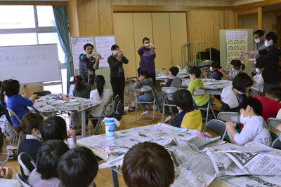 今回の活動場所は気仙沼市立鹿折小学校です。参加した児童、そして私たちは久しぶりの再会を喜びました。学習の時間では児童からたくさんの質問を学生が受けるほど、児童の学習への意識は高く驚きました。