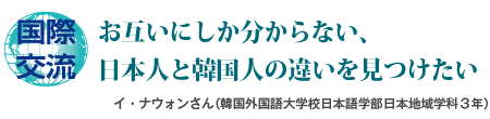 将来は、「せっかく日本語を勉強しているのだから、翻訳家か韓国の企業と日本の企業を結ぶ仕事に就きたい」と夢を描くイさん。そのためにも「言葉の背景にある文化の違いを学びたい」と留学の抱負を語ります。